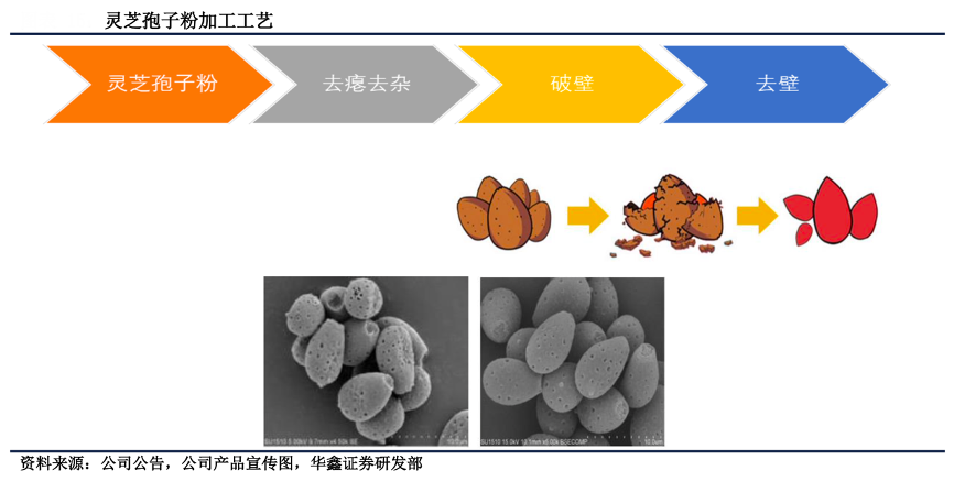 經典案例:根據公司公告、公司產品宣傳圖、華鑫證券研究部等綜合資訊表明,壽仙谷公司開發(fā)了靈芝孢子粉系列產品。其中,中藥飲片——壽仙 谷靈芝孢子粉(破壁)是“仙芝 1 號”經過破壁技術加工后得到的產品;保健品—— 壽仙谷破壁靈芝孢子粉/顆粒是“仙芝 2 號”經過去壁技術加工后得到的產品。另外還有靈芝孢子片劑和芝孢子油軟膠囊等多種劑型產品。
