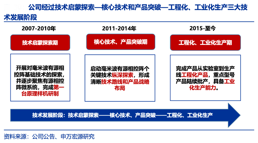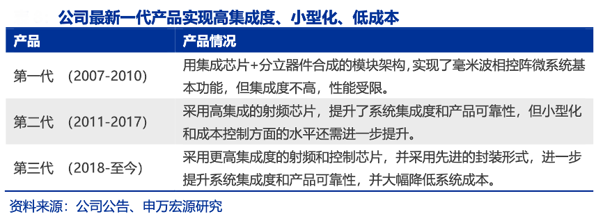 經(jīng)典案例:根據(jù)公司公告、申萬(wàn)宏源研究等綜合資訊表明,毫雷電微力 公司自成立伊始便聚焦毫米波有源相控陣領(lǐng)域研究,至今技術(shù)積 累已有 14 年,目前已率先攻克底層技術(shù)、制作工藝、工業(yè)化生產(chǎn)三大難題。產(chǎn)品從滿(mǎn)足基本性能到高集成度、高可靠性,再到小型化和系統(tǒng)成本降低,實(shí)現(xiàn)了三代跨越式發(fā)展。