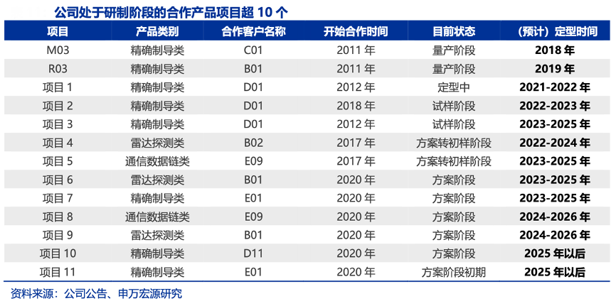 經(jīng)典案例:根據(jù)公司公告、申萬宏源研究等綜合資訊表明,雷電微力公司目前與多個總體單位協(xié)作配套研制 10 余個型號產(chǎn)品,相關(guān)產(chǎn)品處于方案、初樣、試樣、定型批產(chǎn)等不同階段,預(yù)計(jì)未來幾年其將陸續(xù)有新的產(chǎn)品定型并批產(chǎn)供貨。