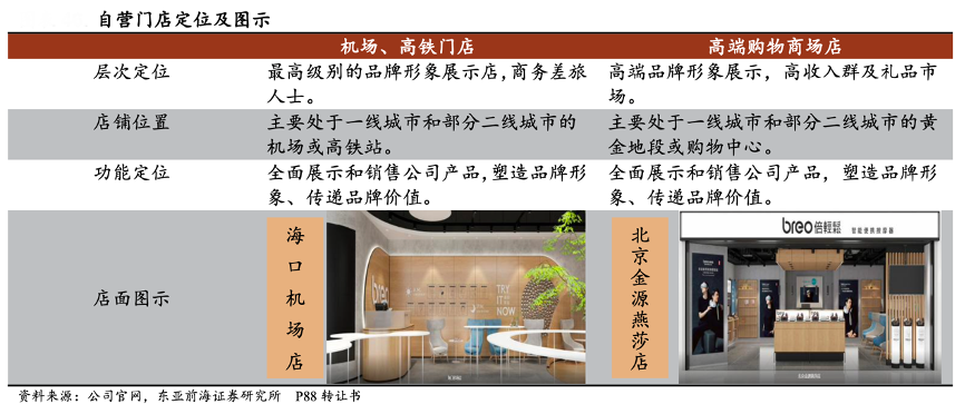 經(jīng)典案例:根據(jù)公司官網(wǎng)、東亞前海證券研究、P88轉(zhuǎn)讓書等綜合資訊表明,截至 2020 年末,倍輕松公司在全國各大城市共有 165 家直營門店,主要分布在一二線城市的高鐵、機場和中高端購物商場,渠道布局與公司線下目標客群商務(wù)人士的消費場景十分契合。通過高勢能門店的布局,其將自身品牌、產(chǎn)品精準觸達到中高端優(yōu)質(zhì)客戶群體,提供更好的產(chǎn)品購買體驗以加強品牌認知及信任感。