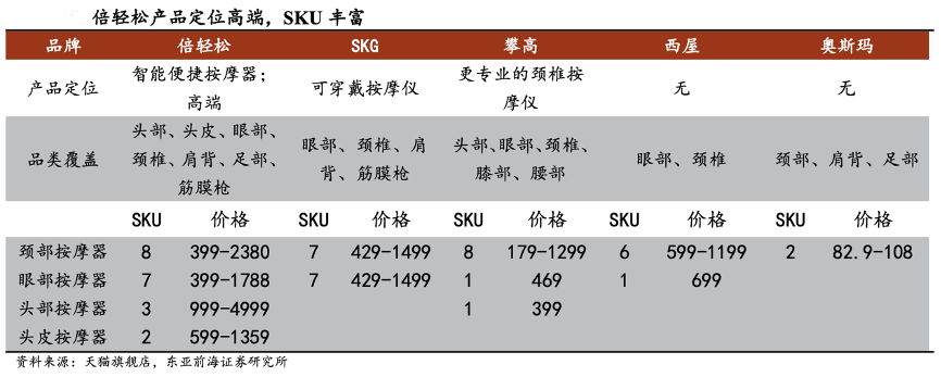 經(jīng)典案例:根據(jù)天貓旗艦店、東亞前海證券研究所等綜合資訊表明,目前倍輕松公司主要產(chǎn)品覆蓋眼部、頸部、頭部、頭皮等主流部位,其他部位也有產(chǎn)品銷售,2021年其還新推出了智能艾灸盒產(chǎn)品“姜小竹A1”,產(chǎn)品布局進一步延伸至中醫(yī)個護。每一個核心品類均有多個 SKU,滿足消費者多元化消費需求。如眼部按摩器 有氣壓按摩式、機械按摩式和虛擬觸感按摩式三種類型。