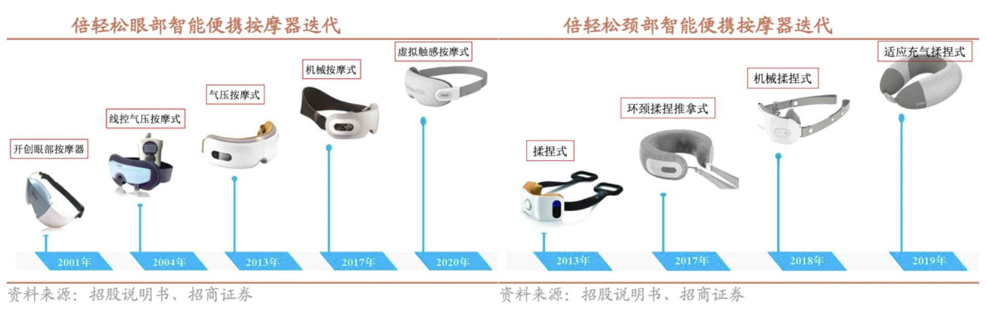 經(jīng)典案例:根據(jù)招股說(shuō)明書(shū)、招商證券等綜合資訊表明,倍輕松公司積極推進(jìn)產(chǎn)品迭代,積極探索新一代信息技術(shù)、精密驅(qū)動(dòng)、仿生技術(shù)、人工智能、物聯(lián)網(wǎng)等技術(shù)的發(fā)展,并將其應(yīng)用于眼部、頸部、頭部及頭皮智能便攜按摩器等主要產(chǎn)品。以其眼部及頸部按摩器產(chǎn)品為例,在功能和外 觀上均有較快迭代。除了不同代際的產(chǎn)品迭代外,其SKU迭代速度也較快,其于近年陸續(xù)推出了 iSee X2pro、 iNeck M2、iNeck 4 等眼部及頸部按摩款式。