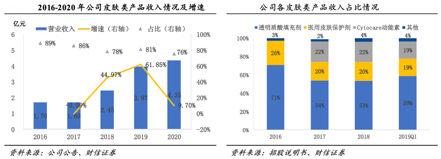 經(jīng)典案例:根據(jù)公司公告、招股說明書、財信證券等綜合資訊表明,2016-2019 年華熙生物公司皮膚類產(chǎn)品收入CAGR 為 32.62%,2020 年全年實現(xiàn)收入 4.35 億元,占整體醫(yī)療終端業(yè)務(wù)收入的 75.52%,占比仍為最高。細分產(chǎn)品來看,公司皮膚類產(chǎn)品豐富,由透明質(zhì)酸填充劑(包括單相不含麻/單相含 麻/雙相不含麻/雙相含麻產(chǎn)品)、醫(yī)用皮膚保護劑、Cytocare 動能素(屬于水光針類產(chǎn)品, Cytocare 旗下產(chǎn)品均為歐盟 III 類醫(yī)療器械)等三種產(chǎn)品組成,其中透明質(zhì)酸填充劑 2018 年 實現(xiàn)收入 1.31 億元,占比超過 50%。