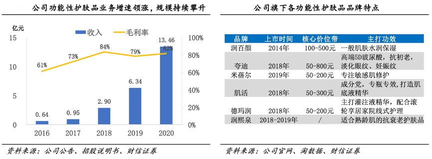 經(jīng)典案例:根據(jù)公司公告、公司官網(wǎng)、淘數(shù)據(jù)、招股說(shuō)明書(shū)、財(cái)信證券等綜合資訊表明,華熙生物依托強(qiáng)大的原料優(yōu)勢(shì)和醫(yī)美產(chǎn)品的初始消費(fèi)者積累,2014 年其旗下品牌潤(rùn)百顏推出“蜂巢玻尿酸水潤(rùn)次拋”,成功進(jìn)軍功能性護(hù)膚品領(lǐng)域。其現(xiàn)階段擁有四大核心功能性護(hù)膚品牌,從功效看,潤(rùn)百顏主打保濕補(bǔ)水功效,夸迪定位抗初老,米蓓爾專(zhuān)注敏感肌,肌活針對(duì)成分黨。2020 年,潤(rùn)百顏/夸迪/米蓓爾/肌活分別實(shí)現(xiàn)收入 5.65/3.91/1.99/1.13 億元,同比分別增長(zhǎng) 65.29%/513.29%/136.32%/45.71%,毛利率分別提升2.80/5.95/0.53/9.82pct。