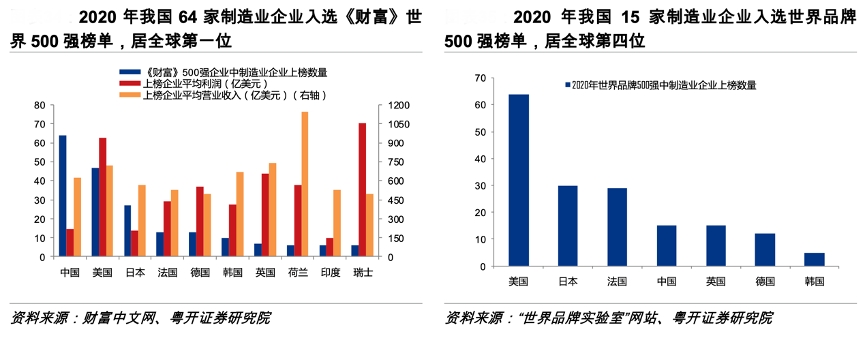 經(jīng)典案例:根據(jù)財(cái)富中文網(wǎng)、“世界品牌實(shí)驗(yàn)室”網(wǎng)站、粵開證券研究院等綜合資訊表明,從企業(yè)規(guī)??矗?020年我國共有 64 家制造業(yè)企業(yè)入選《財(cái)富》世界 500 強(qiáng)榜單, 位列世界第一。我國上榜制造業(yè)企業(yè)平均營業(yè)收入為622 億美元,與全部上榜制造業(yè)企 業(yè)平均值大致相當(dāng)。從知名品牌看,2020 年我國有 15 家制造業(yè)企業(yè)入選世界品牌 500 強(qiáng),數(shù)量名列全 球第四,品牌影響力弱于數(shù)量。美國擁有 64 個(gè)制造業(yè)世界知名品牌,集中在食品、電子 和汽車領(lǐng)域。日本、法國分別擁有 30 個(gè)和 29 個(gè),分別集中在汽車和機(jī)械、奢侈品領(lǐng)域。