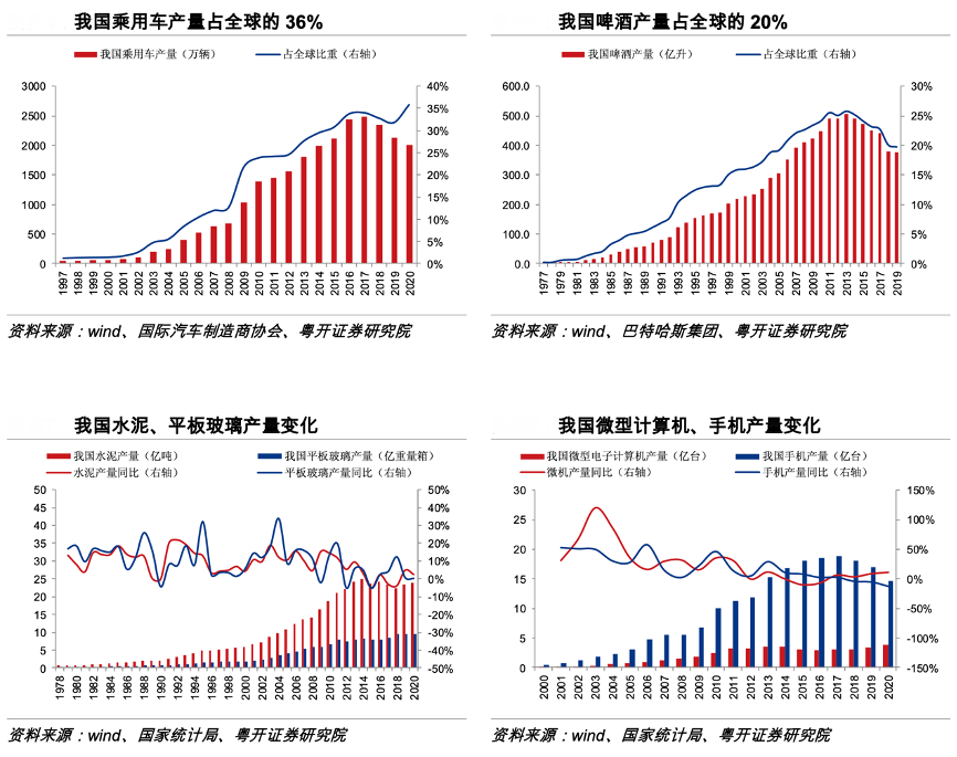 經(jīng)典案例:根據(jù)wind、國際汽車制造商協(xié)會(huì)、巴特哈斯集團(tuán)、粵開證券研究院等綜合資訊表明,我國各類工業(yè)品產(chǎn)量大幅增長,220多種工業(yè)產(chǎn)品產(chǎn)量位居世界首位。原材料類工業(yè)品產(chǎn)量增長對(duì)工業(yè)化建設(shè)形成保障,如我國粗鋼產(chǎn)量已達(dá)到 100 萬噸量級(jí),占全球粗 鋼產(chǎn)量比重達(dá) 53%,鋁冶煉產(chǎn)量占全球的 57%,水泥、平板玻璃等產(chǎn)品產(chǎn)量大幅提升。 消費(fèi)類工業(yè)品產(chǎn)量增長積極滿足國內(nèi)外市場(chǎng)需求,如我國乘用車產(chǎn)量已達(dá)到全球的 36%, 計(jì)算機(jī)、手機(jī)等產(chǎn)品產(chǎn)量大幅上升。