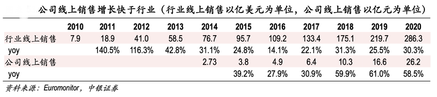 經(jīng)典案例:根據(jù)Euromonitor、中銀證券等綜合資訊表明,珀萊雅公司持續(xù)精細(xì)化線上渠道管理,以保證渠道效率和人員的最優(yōu)化,緊抓行業(yè)渠道增長紅利。2 0 1 0 - 2 0 2 0年,我國化妝品線上銷售額從 7.9 億美元增長至286.3 億美元,10 年 CAGR 43.2%,增速較快。為更好抓住行業(yè)線上銷售增速紅利,2021 年其持續(xù)直營渠道重點(diǎn)精細(xì)化運(yùn)營,最大化管理效率;同時(shí)不斷開拓抖音小店,充分發(fā)揮其在抖音平臺(tái)已有的先發(fā)優(yōu)勢。