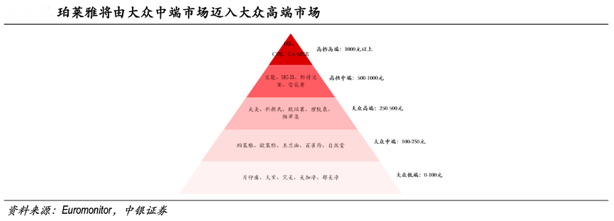 經(jīng)典案例:根據(jù)Euromonitor、中銀證券等綜合資訊表明,珀萊雅公司憑借其自身的強(qiáng)產(chǎn)品力和營銷力,進(jìn)一步推動(dòng)“珀萊雅”品牌升級計(jì)劃,欲吸引更多一二線年輕消費(fèi)群,升級消費(fèi)者層次: “珀萊雅”品牌將嘗試300元以上的主推單品,以實(shí)現(xiàn)單價(jià)逐漸升級,由大眾中端邁入大眾高端品牌。而國有品牌大多主打大眾中低端,“珀萊雅”有望拉開與該類品牌之間的差距,提升市占率。