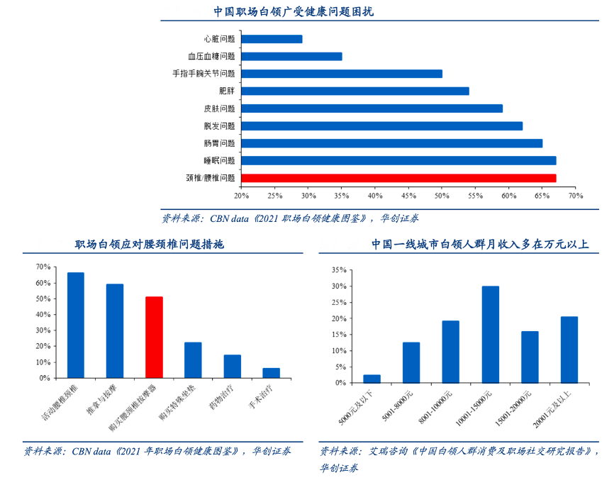 經(jīng)典案例:根據(jù)CBN data《2021年職場(chǎng)白領(lǐng)健康圖鑒》、華創(chuàng)證券、艾瑞咨詢《中國(guó)白領(lǐng)人群消費(fèi)及職場(chǎng)社交研究報(bào)告》等綜合資訊表明,在白領(lǐng)中腰椎/頸椎問題最為常見,比重達(dá)到 67%,是與睡眠問題并列的最普遍職場(chǎng)健康問題。
