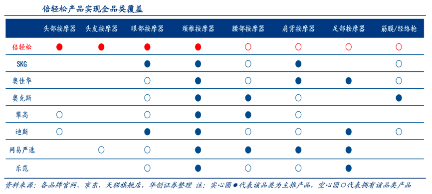 經(jīng)典案例:根據(jù)各品牌官網(wǎng)、京東、天貓旗艦店、華創(chuàng)證券等綜合資訊表明,基于此前統(tǒng)計(jì),眼部、頸椎等按摩產(chǎn)品為主要需求及當(dāng)下主要規(guī)模品類,各類企業(yè)均有布局。在此基礎(chǔ)上,倍輕松在深耕眼部、頸部等主流按摩器具的基礎(chǔ)上,實(shí)現(xiàn)了對(duì)小型按摩器品類的全覆蓋,將有助于其市占率的持續(xù)提升。