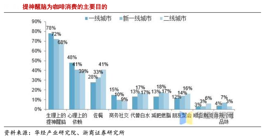 經(jīng)典案例:根據(jù)華經(jīng)產(chǎn)業(yè)研究院、浙商證券研究所等綜合資訊表明,結(jié)合相關(guān)行業(yè)數(shù)據(jù),商務(wù)社交等需第三空間的咖啡消費(fèi)目的目前僅排名第四,“提神醒腦”的功能性消費(fèi)才是目前最重要的咖啡消費(fèi)目的。