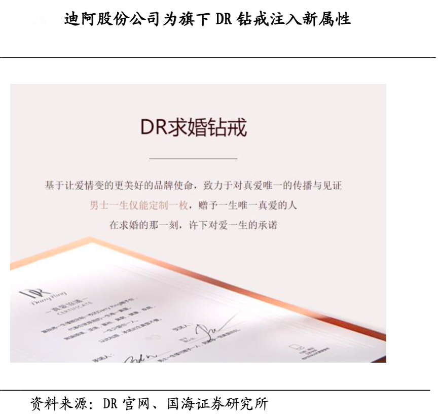 經(jīng)典案例:根據(jù)Dr官網(wǎng)、國(guó)海證券研究所等綜合資訊表明,近年來國(guó)內(nèi)新鉆戒 DR 開創(chuàng)了“一生只送一人”的購買規(guī)則,通過傳達(dá)“一生·唯一·真愛”的愛情觀為品牌鉆戒賦予新屬性,成為具有較強(qiáng)市場(chǎng)競(jìng)爭(zhēng)力的求婚鉆戒品牌,招股說明書上 ROE 水平遠(yuǎn)超同業(yè)上市公司。