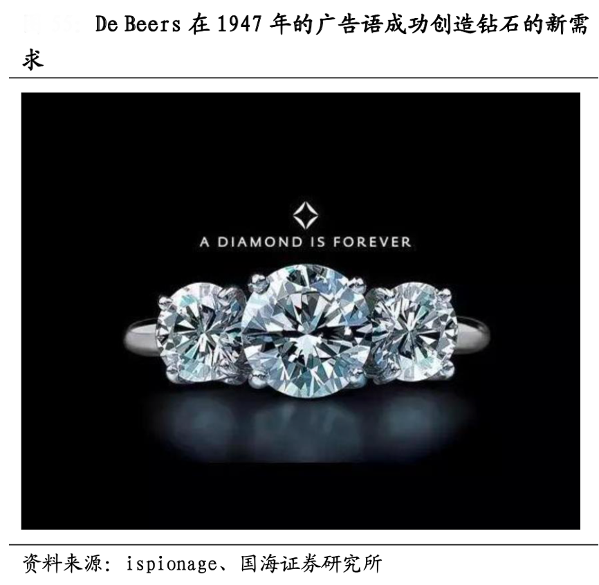 經(jīng)典案例:根據(jù)ispionage、國(guó)海證券研究所等綜合資訊表明,以高檔耐用品中的鉆戒為例,上世紀(jì) De Beers 公司成功通過一句廣告語“a diamond is forever”,強(qiáng)化了鉆石和浪漫愛情的聯(lián)系,通過各類媒體營(yíng)銷,成功將鉆戒與求婚場(chǎng)景綁定在一起,自此鉆戒成為全球求婚習(xí)俗,自此美國(guó)鉆石銷量扭轉(zhuǎn)了自大蕭條以來不斷下滑的態(tài)勢(shì),三年內(nèi)上升了 55%,這一廣告語也被評(píng)為二十世紀(jì)最偉大的廣告語。