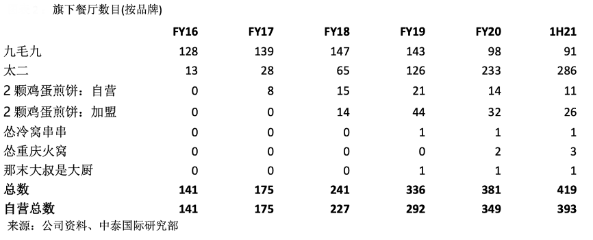 經典案例:根據(jù)公司資料、中泰國際研究部等綜合資訊表明,九毛九旗下截至 2021年6月底,共有 419 家門店,其中 418 家位 處中國內地,1 家位處加拿大。華南地區(qū)為集團的大本營及發(fā)跡地,其中共有 243 家門店。華中及華東、西部地區(qū)、華北及東北分別設有 122 家、21 家及 31 家門店。