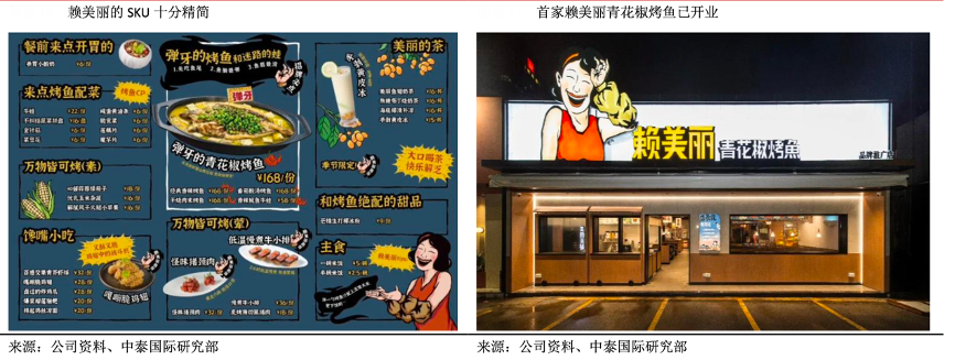 經典案例:根據(jù)公司資料、中泰國際研究部等綜合資訊表明,九毛九旗下借鑒太二的經驗,其再切入火鍋賽道,成立“慫重慶火鍋廠“,只賣一種鍋底-牛油辣搭果蔬鴛鴦鍋;SUK僅50個左右;店鋪融入酒吧、搖滾、夜店等風格(包括每晚的跳舞環(huán)節(jié)“Happy Time”),與傳統(tǒng)的火鍋店不同。烤魚新品牌“賴美麗青花椒烤魚”已于 8 月 18 日在廣州馬場美食城開業(yè)。賴美麗的產品延 續(xù)了九毛九一貫的風格,SKU 只有 23 個,十分精簡。主要包括烤魚、燒烤、小吃、甜品數(shù)大類,僅賣一種魚-江團魚。