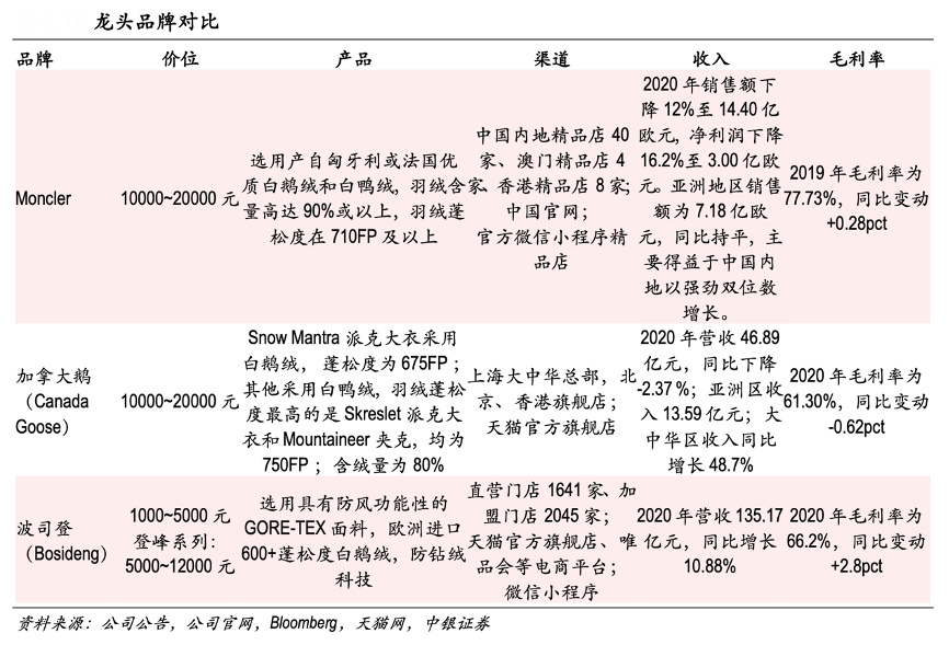 經典案例:根據公司公告、公司官網、Bloomberg、天貓網、中銀證券等綜合資訊表明,國際品牌將高端產品帶入中國羽絨服市場,刺激了中國市場對羽絨服時尚化與功能性的需求。時尚設計層面,Moncler 邀請?zhí)觳旁O計師、注重大牌 聯名打造冬季潮流,加拿大鵝以美觀的派克大衣款式得到包括眾多明星在內的消費者的喜愛。龍頭品牌羽絨蓬松度均在 600 以上,Moncler、波司登選擇同一家瑞士藍標認證羽絨供應商的優(yōu)質羽絨。波司登緊跟國際品牌腳步發(fā)展設計師聯名款,研發(fā)“登峰系列”提高蓬松度達 1000+、含絨量為極限 95%,與國際品牌比肩,繼續(xù)向中高端羽絨服品牌滲透。
