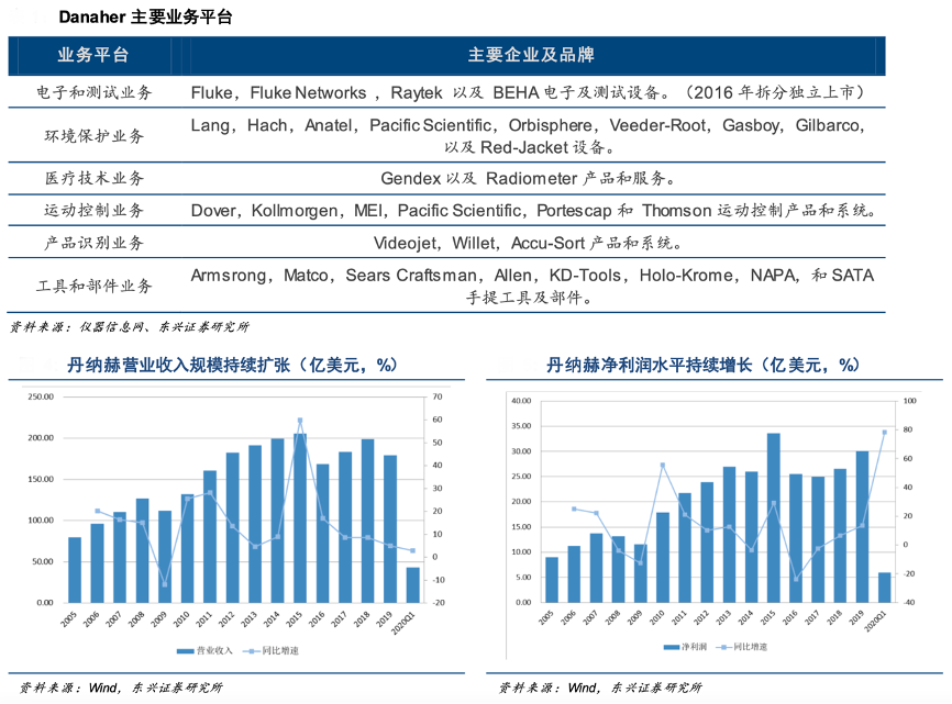 經(jīng)典案例:根據(jù)儀器信息網(wǎng)、wind、東興證券研究所等綜合資訊表明,2019 年,丹納赫營(yíng)業(yè)收入達(dá)到 179.11 億美元,凈利潤(rùn)達(dá)到 30.08 億美元。截止 2020 年 5 月 26 日,丹納赫公司總市值達(dá)到 1106 億美元。