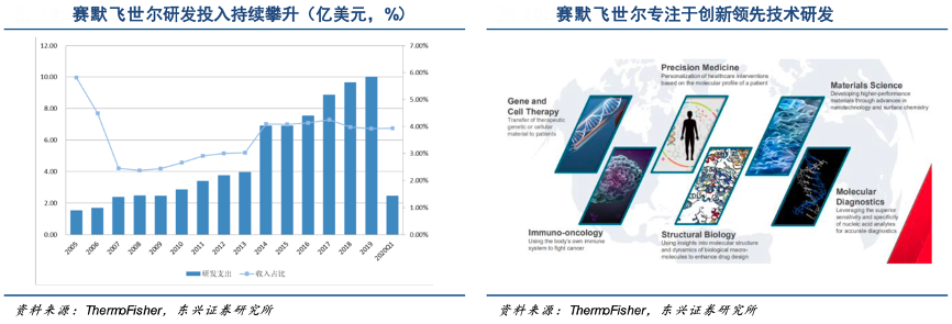 經(jīng)典案例:根據(jù)ThermoFisher、東興證券研究所等綜合資訊表明,研發(fā)方面,賽默飛世爾2019年投入超過 10 億美元,近年來研發(fā)投入比例基本維持在 4%左右,使得其在質(zhì)譜分析、色譜分析、電鏡成像、生物科學(xué)、生物制品、下一代測(cè)序技術(shù)、免疫診斷等領(lǐng)域保持技術(shù)領(lǐng)先。