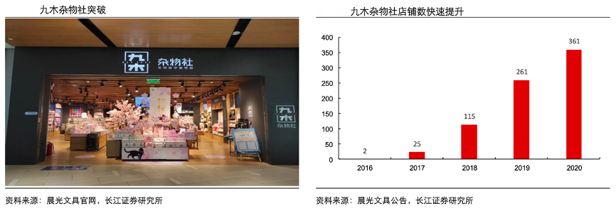 經(jīng)典案例:根據(jù)晨光文具官網(wǎng)、公司公告、長江證券研究所等綜合資訊表明,九木雜物社于 2016 年正式推出,面向 15-35 歲年輕女性群體,多開設(shè)在購物中心內(nèi),產(chǎn)品品類包括盲盒公仔、手工拼搭、家居日用、手賬文具、穿搭配飾、生活數(shù)碼和禮信小物,2018 年開放加盟,到 2020 年已 經(jīng)有 361 家門店(其中直營 237 家,加盟 124 家)。