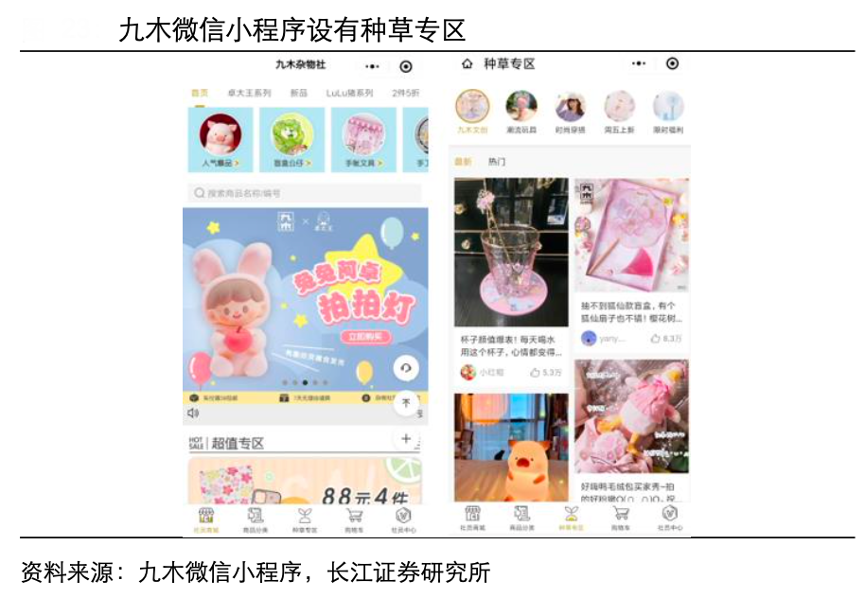 經(jīng)典案例:根據(jù)九木微信小程序、長江證券研究所等綜合資訊表明,九木雜物社利用微信小程序作為流量入口,借助微博話題營銷、小紅書等引流,在小程序上開設(shè)種草專區(qū)鼓勵買家表達購物體驗,充分利用社交電商的示范效應(yīng)。