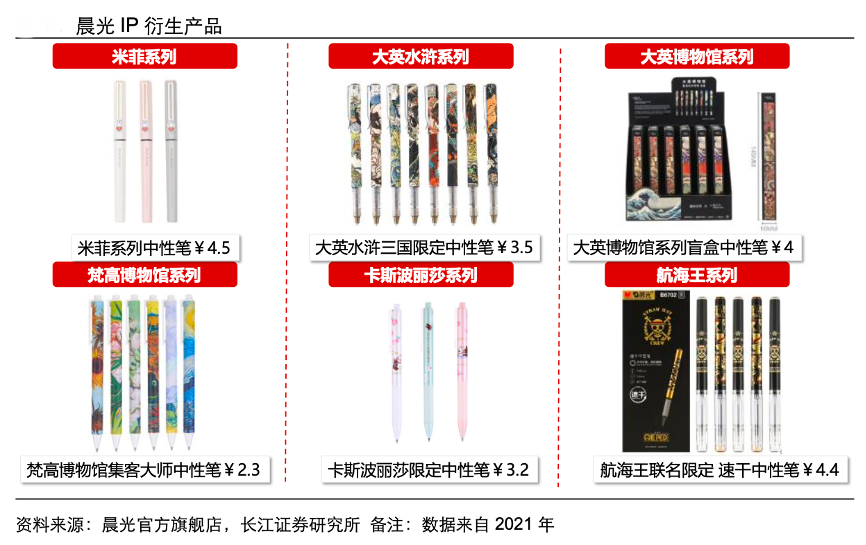 經(jīng)典案例:根據(jù)晨光官方旗艦店、長(zhǎng)江證券研究所等綜合資訊表明,晨光豐富 IP 資源使產(chǎn)品更美觀:旗下 IP 包括米菲、Nanci、大英博物館等 10 大 IP,其中大英博物館旗下又包括水滸豪杰、水滸三國(guó)、愛(ài)麗絲等多個(gè)子IP,而其他品牌設(shè)計(jì)相對(duì)簡(jiǎn)單。