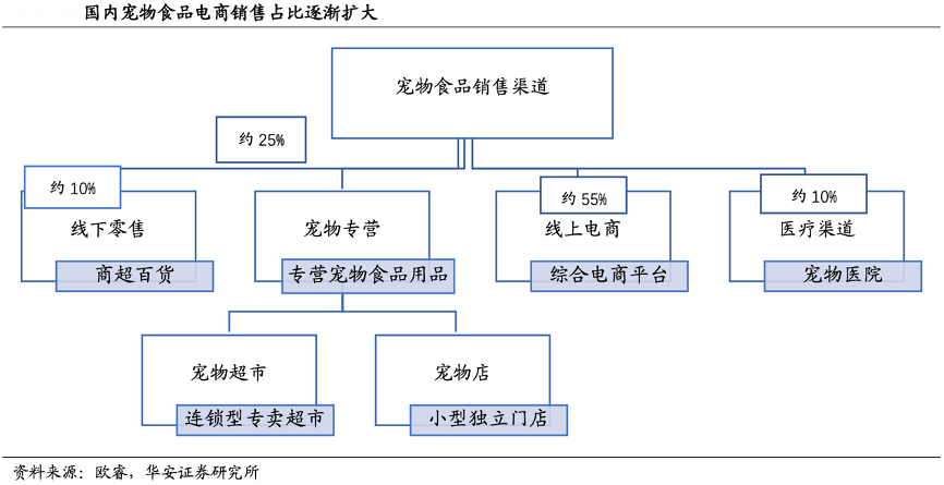 經(jīng)典案例:根據(jù)歐睿、華安證券研究所等綜合資訊表明,寵物食品呈現(xiàn)高電商滲透率特點,線上銷售占比超50%。根據(jù)歐睿數(shù)據(jù),目前中國寵物食品銷售渠道中線上銷售占比超 50%,寵物店達25%,商超渠道約占10%。受近幾年線上購物發(fā)展趨勢影響,疊加疫情因素眾多寵物店線下門店未開業(yè),加之寵物食品國貨品牌行業(yè)集中度較低,線上寵物食品品牌數(shù)量超過 400 個,電商已經(jīng)成為寵物食品行業(yè)最為重要銷售渠道。