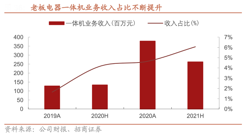 經(jīng)典案例:根據(jù)公司財報、招商證券等綜合資訊表明,2017年老板以蒸烤一體等多功能指標(biāo)作為嵌入式品類主要開發(fā)方向,于次年推出首款蒸烤一體機(jī)產(chǎn)品,目前已覆蓋包括蒸烤一體、蒸烤炸一體、蒸烤微一體、烤煎炸一體等在內(nèi)的多個品類,并作為第一起草單位主導(dǎo)制定了我國蒸 烤一體機(jī)行業(yè)標(biāo)準(zhǔn)。根據(jù)奧維云網(wǎng),2020年其嵌入式一體機(jī)線下 KA 渠道份額已達(dá)到 31.5%,位居第二,全年公司蒸烤一體機(jī)品類共實現(xiàn)營業(yè) 收入 3.8 億元,同比增長 196%,占營業(yè)收入比例同比提升 3.0 pct 至 4.6%。