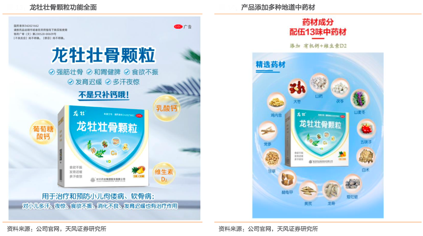 經(jīng)典案例:根據(jù)公司官網(wǎng)、天風(fēng)證券研究所等綜合資訊表明,龍牡壯骨顆粒的組方以“脾腎雙補(bǔ)”的中醫(yī)理論為基礎(chǔ),由玉屏風(fēng)散、四君子湯、龍骨湯三 味經(jīng)典方劑加減化裁而來;多種地道中藥材結(jié)合現(xiàn)代醫(yī)學(xué)研究成果,添加有機(jī)鈣和維生素 D,可以同時(shí)起到強(qiáng)筋壯骨、健脾、健胃的功效,改善脾胃對(duì)營(yíng)養(yǎng)的吸收功能,補(bǔ)鈣同時(shí) 更注重促進(jìn)鈣的吸收,針對(duì)兒童食欲不振、消化不良、發(fā)育遲緩、夜驚、多汗有明顯治療 效果,相較于單一的鈣劑優(yōu)勢(shì)突出。