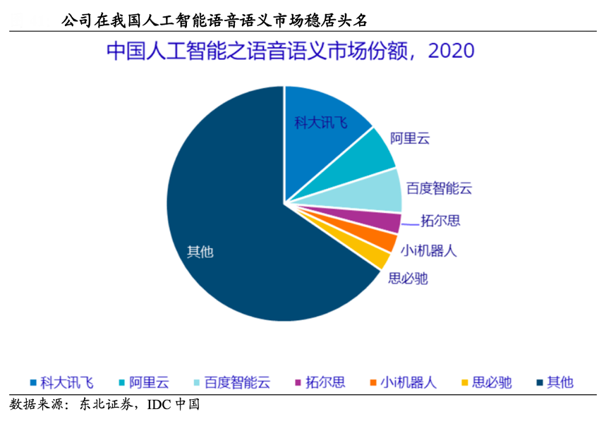 經(jīng)典案例:根據(jù)東北證券、IDC中國等綜合資訊表明,科大訊飛公司深耕語音識 別領(lǐng)域,處于世界領(lǐng)先水平,在多個世界專業(yè)比賽內(nèi)取得冠軍。根據(jù) IDC 發(fā)布的 《中國人工智能軟件及應(yīng)用市場研究報告-2020》顯示,其在中國人工智能語音 語義市場穩(wěn)居頭名。相比于綜合性人工智能開放平臺,其在語音識別、語音合成等垂直領(lǐng)域具有相對技術(shù)優(yōu)勢和豐富應(yīng)用經(jīng)驗,形成一定競爭壁壘。