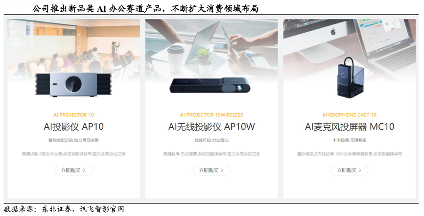 經(jīng)典案例:根據(jù)東北證券、訊飛智影官網(wǎng)等綜合資訊表明,2021 年 9 月 27 日,科大訊飛公司推出訊飛 AI 投影儀 AP10、訊飛 AI 無線投影儀 AP10W、訊飛 AI 麥克風投屏器 MC10 三款全新辦公產(chǎn)品,持續(xù)賦能辦公場景,為職場人群帶來全新的會議記錄方式。其產(chǎn)品主要面向?qū)W習、辦公等場景,避開較為其他較成熟的智能 硬件領(lǐng)域和綜合性大型競爭對手,在語音交互等需求旺盛的場景發(fā)揮公司相關(guān)技術(shù)積累,突出競爭優(yōu)勢。