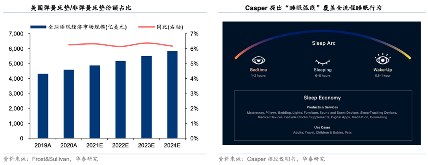 經(jīng)典案例:根據(jù)Frost&Sullivan、Casper招股說明書、華泰研究等綜合資訊表明,結(jié)合Better Sleep Council 研究數(shù)據(jù),近40%的消費(fèi)者選擇通過睡眠產(chǎn)品或服務(wù)改善睡眠質(zhì)量,從 2007 到 2016 年,消費(fèi)者愿意為床墊支付的價格增加了 19%,同時床墊更換周期亦加快了14%。睡眠經(jīng)濟(jì)始于床墊卻不止于床墊,Casper提出“睡眠弧線”覆蓋“就寢-睡眠-醒來”全流程睡眠行為,能夠提供全面睡眠解決方案的品牌逐步受到消費(fèi)者追捧。