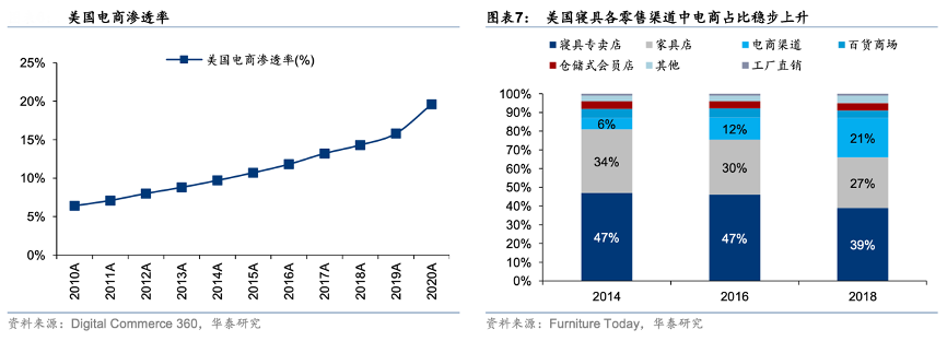 經(jīng)典案例:根據(jù)Digital Commerce 360、Furniture Today、華泰研究等綜合資訊表明,在電商平臺崛起、消費(fèi)者消費(fèi)習(xí)慣改變、物流條件改善、床墊廠商推動產(chǎn)品及服務(wù)創(chuàng)新等因素共同推動下,近年來美國床墊消費(fèi)線上渠道占比快速提升,據(jù) Furniture Today 數(shù)據(jù),2018年電商渠道收入占到美國寢具零售渠道的 21%,較 2016 年上升9pct。根據(jù) Statista 統(tǒng)計,2021年美國床墊線上銷售比例預(yù)計達(dá)27%。
