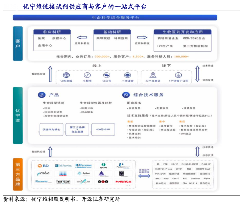 經(jīng)典案例:根據(jù)優(yōu)寧維招股說明書、開源證券研究所等綜合資訊表明,優(yōu)寧維公司是一家面向高等院校、科研院所、醫(yī)院和生物醫(yī)藥企業(yè)等,提供以抗體為 核心的生命科學(xué)試劑及相關(guān)儀器、耗材和綜合技術(shù)服務(wù)的科學(xué)服務(wù)商。目前,其整合了 50 多家行業(yè)知名品牌的抗體產(chǎn)品,形成了以第三方品牌產(chǎn)品為主、自主品牌產(chǎn)品為輔的供應(yīng)體系。