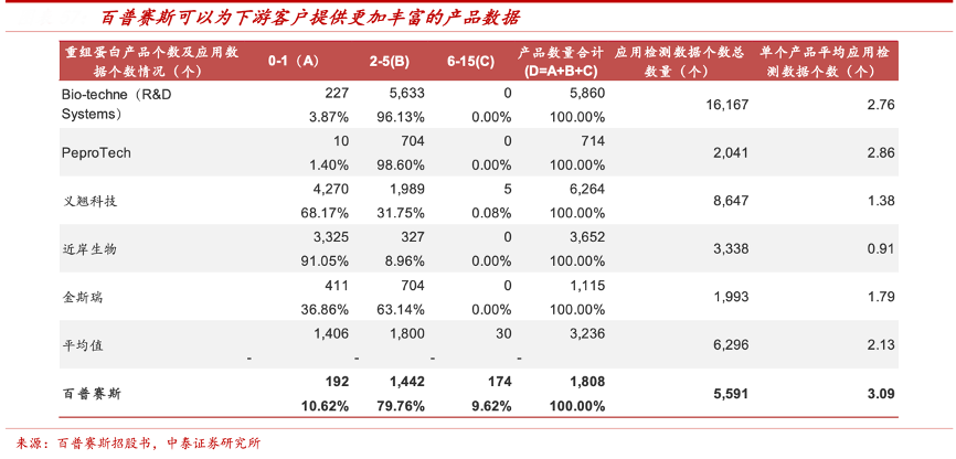 經(jīng)典案例:根據(jù)百普賽斯招股書、中泰證券研究所等綜合資訊表明,百普賽斯聚焦于生物藥尤其是靶點(diǎn)藥開發(fā)與應(yīng)用場(chǎng)景,向客戶提供多維度產(chǎn)品應(yīng)用檢測(cè)數(shù)據(jù),可以大幅度節(jié)省客戶進(jìn)行實(shí)驗(yàn)的時(shí)間和成本,為客戶提供經(jīng)過驗(yàn)證和優(yōu) 化的實(shí)驗(yàn)方案。其產(chǎn)品平均應(yīng)用檢測(cè)數(shù)據(jù)個(gè)數(shù)為 3.09 個(gè),顯著優(yōu)于 Bio-techne(2.76)、Peprotech(2.86)、金斯瑞(1.79)等同業(yè)產(chǎn)品。