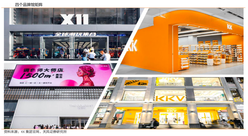 經(jīng)典案例:根據(jù)KK集團(tuán)官網(wǎng)、天風(fēng)證券研究所等綜合資訊表明,KK公司專注于潮流零售店的運營,通過 DTC 模式向終端消費者提供各具特色的商品。商品橫跨美妝、潮玩、食品飲料、家居日用、文具等主要核心生活用品的 18 個主要品類,潮流單品 SKU 超 20000。過去幾年集團(tuán)品牌矩陣不斷拓展,當(dāng)前主要經(jīng)營四個潮流零售品牌,「KK 館」、「KKV」、「THE COLORIST 調(diào)色師」和「X11」,旨在滿足國內(nèi)消費者的不同市場需求。如“KK館”品牌定位為生活方式迷你賣場,為消費者提供契合生活日用場景的各種國內(nèi)和進(jìn)口的多元品類商品。