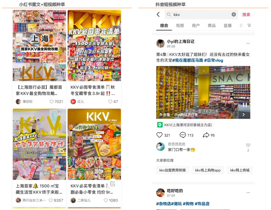 經(jīng)典案例:根據(jù)小紅書APP、抖音APP、天風(fēng)證券研究所等綜合資訊表明,KKV通過“紅人營銷+新媒體營銷”,打造線上種草線下拔草新消費閉環(huán)。承載短視頻、圖文的如抖音、小紅書等內(nèi)容平臺帶火了新式營銷方法,核心優(yōu)勢類目著重 KOL/KOC 投放,通過線上分享消費體驗,引發(fā)社區(qū)互動,并推動其他用戶線下消費買單。