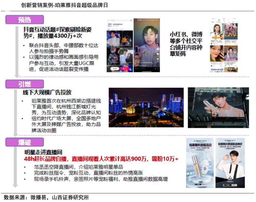 經(jīng)典案例:根據(jù)微播易、山西證券研究所等綜合資訊表明,同其它電商平臺相比,抖音電商以興趣為導(dǎo)向、內(nèi)容垂直圈層傳播的差異化特征明顯,珀萊雅與抖音聯(lián)合,共同打造推出“珀萊雅抖音超級品牌日”。在整個超品日活動期間(7月23日—7月29日),珀萊雅通過代言人直播互動、線下實景搭建自播間、抖音互動話題引流等方式,搭建起全鏈路營銷體系,整體活動實現(xiàn)億級曝光量,GMV達到6000萬元。