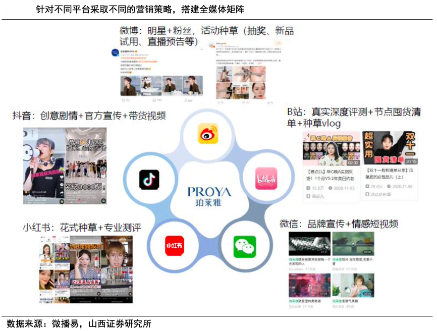 經(jīng)典案例:根據(jù)微播易、山西證券研究所等綜合資訊表明,在內(nèi)容種草層面上,珀萊雅活用小紅書投放鏈路,通過爆文快速打響聲量,全方位攔截潛在用戶及意向用戶,模擬用戶搜索場景占領(lǐng)搜索詞,投放相關(guān)內(nèi)容,直接解決用戶需求。截至 2021 年 11 月,珀萊雅品牌在各大社媒平臺聲量領(lǐng)跑其他國貨護膚品牌,抖音粉絲數(shù)突破304萬人,微博發(fā)布數(shù)量超 1.2 萬條,小紅書獲贊與收藏達 40.8 萬個。