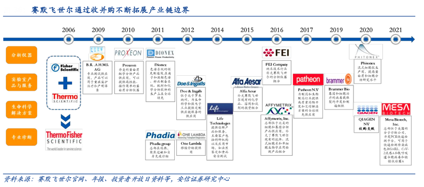 經(jīng)典案例:根據(jù)賽默飛世爾官網(wǎng)、年報、投資者開放日資料、安信證券研究中心等綜合資訊表明,賽默飛世爾(Thermo Fisher)是全球領(lǐng)先的生命科學(xué)服務(wù)龍頭,其主營業(yè)務(wù)是為實驗室場景提供科學(xué)儀器、 實驗耗材、科研試劑、綜合服務(wù)等科學(xué)服務(wù)產(chǎn)品。在長達(dá)幾十年的商業(yè)拓展中,其通過收并購自然衍生出專業(yè)診斷(IVD)、制藥裝備、CDMO 等相對處于產(chǎn)業(yè)鏈下游的業(yè)務(wù)。2020年其實現(xiàn)營業(yè)收入 322 億美元,截至 2021 年 11 月 9 日,公司市值達(dá)到 2,438 億美元。