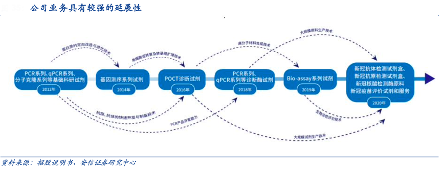 經(jīng)典案例:根據(jù)招股說明書、安信證券研究中心等綜合資訊表明,諾唯贊公司具備蛋白質(zhì)定向改造與進(jìn)化平臺、基于單 B 細(xì)胞的高性能抗體發(fā)現(xiàn)平臺、規(guī)模化多系統(tǒng)重組蛋白制備平臺、量子點修飾偶聯(lián)與多指標(biāo)聯(lián)檢技術(shù)平臺,通過生物試劑和POCT診斷試劑兩類核心產(chǎn)品,深度融合生物醫(yī)藥、分子診斷、基因測序等產(chǎn)業(yè)鏈。