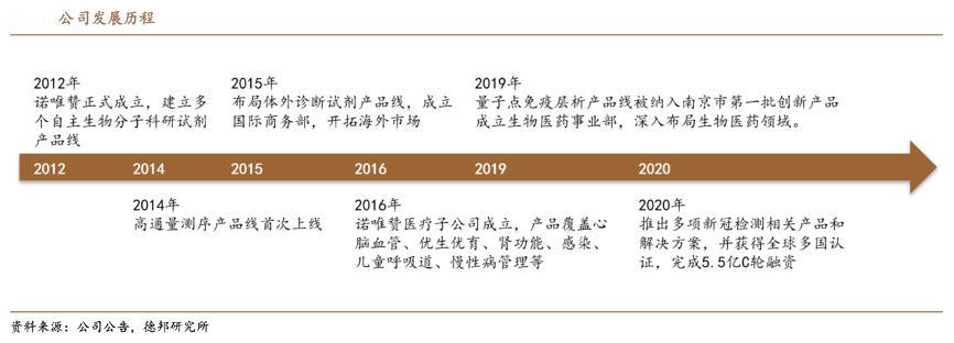 經(jīng)典案例:根據(jù)公司公告、德邦研究所等綜合資訊表明,南京諾唯贊生物成立于2012年,業(yè)務(wù)覆蓋生物試劑、體外診斷和生物醫(yī)藥,是一家圍繞酶、抗原、抗體等功能性蛋白進行技術(shù)研發(fā)和產(chǎn)品開發(fā)的生物科技企業(yè),現(xiàn)有200余種基因工程重組酶和 1000 余種高性能抗原和單克隆抗體等關(guān)鍵原料,擁有 500 多個終端產(chǎn)品,可廣泛應(yīng)用于科學(xué)研究、高通量測序、體外診斷、醫(yī)藥及疫苗研發(fā)和動物檢疫等領(lǐng)域,是國內(nèi)少數(shù)同時具有自主可控上游技術(shù)開發(fā)能力和終端產(chǎn)品生產(chǎn)能力的研發(fā)創(chuàng)新型企業(yè)。