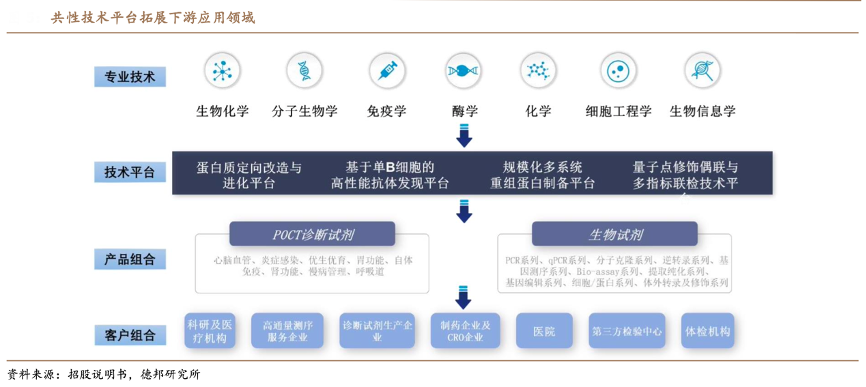 經(jīng)典案例:根據(jù)招股說明書、德邦研究所等綜合資訊表明,諾唯贊公司基于其獨立的技術(shù)平臺,拓展了廣泛的下游應(yīng)用領(lǐng)域。1)其推出包含PCR 系列、qPCR 系列、分子克隆系列、逆轉(zhuǎn)錄系列等多個系列的生物試劑以及包含心腦血管、炎癥感染、優(yōu)生優(yōu)育、胃功能等 8 個系列的 POCT 診斷試劑;2)形成了多重客戶群體組合:科研院校、高通量測序服務(wù)企業(yè)、分子診斷試劑生產(chǎn)企業(yè)、制藥企業(yè)、CRO企業(yè)、醫(yī)院等醫(yī)療機構(gòu)。