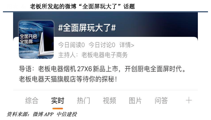 經(jīng)典案例:根據(jù)微博APP、中信建投等綜合資訊表明,老板近年積極迎合媒體發(fā)展新趨勢,為傳統(tǒng)煙灶品類打造了一系列年輕化營銷方案。舉例來說,2018 年老板在微博發(fā)起“全面屏玩大了”話題為款全面屏油煙機(jī) 27X6 造勢,活動(dòng)期間話題熱度一度達(dá)到 20 萬,極大吸引了年輕消費(fèi)群體,使得產(chǎn)品曝光度大幅提升。