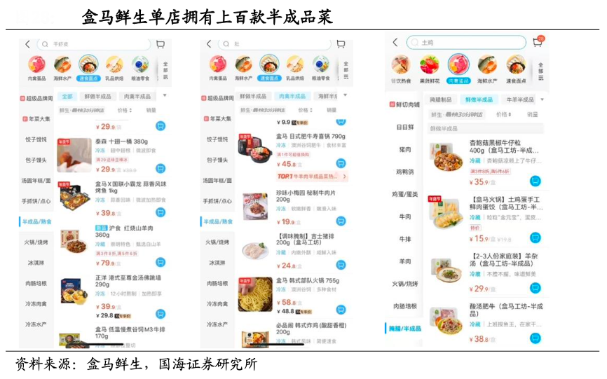 新零售渠道也加大了對預制菜品類的布局。盒馬于 2021 年調整組織架構,升級 盒馬工坊為 3R 事業(yè)部,3R 即預制菜的三種分類(Ready to cook, ready to heat, ready to eat)品類,自研商品占 60%,與餐飲/食品品牌合作比例40%。每日優(yōu)鮮推出“名菜名店”頻道,與西貝、眉州東坡等餐飲合作研發(fā)預制菜,并加大與食品品牌、地方知名餐飲的合作力度。