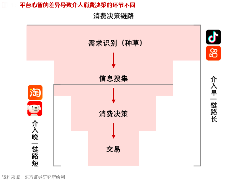 經(jīng)典案例:根據(jù)東方證券研究所等綜合資訊表明,拆解用戶消費(fèi)的過程,是由“需求識別→信息搜集→消費(fèi)決策→成交”幾個(gè)環(huán)節(jié)構(gòu)成,平臺(tái)屬性決定了內(nèi)容型平臺(tái)對用戶的影響是從“需求識別”就開始了,影響用戶的時(shí)間更早(品宣的效果更好),但是離最終成交更遠(yuǎn)(所以轉(zhuǎn)化率整體很難比傳統(tǒng)貨架式電商高);純電商平臺(tái)通常從“信息搜集” 環(huán)節(jié)或“消費(fèi)決策”環(huán)節(jié)發(fā)揮作用,對用戶的消費(fèi)決策的影響相對晚,但是離成交近(轉(zhuǎn)化率天然會(huì)比內(nèi)容電商高)。