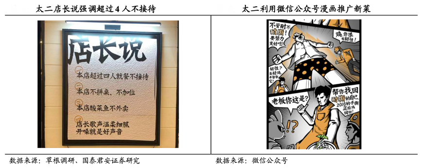經(jīng)典案例:根據(jù)草根調(diào)研、微信公眾號、國泰君安證券研究等綜合資訊表明,太二打造獨特品牌文化。(1)打造IP:設(shè)計“二老板”和“小二哥”的 IP 形 象,通過漫畫故事打造人物。(2)反向營銷;太二店長說強調(diào)原則“超過4人不接待、不拼桌不加位等”,塑造獨特二文化。(3)打造特色門店:周年打造快閃店,包括二周年慶快閃博物館、三周年慶中醫(yī)館、四周年慶酸菜探索基地、五周年慶太二澡堂、六周年慶太二發(fā)廊;開設(shè)超級粉絲店。