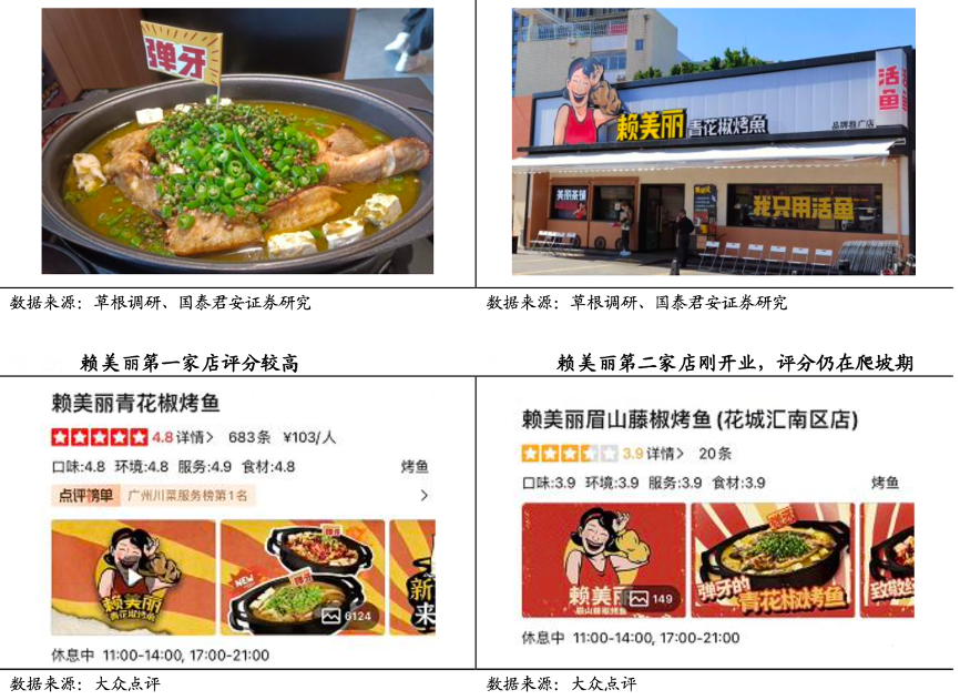 經(jīng)典案例:根據(jù)草根調(diào)研、大眾點(diǎn)評(píng)、國(guó)泰君安證券研究等綜合資訊表明,太二賴(lài)美麗烤魚(yú)第二家門(mén)店廣州花城匯南區(qū)店于 2021 年 12 月30 日開(kāi)業(yè),12 月 30日到 1 月 2日 全場(chǎng) 68 折,主打只賣(mài)活魚(yú)(活魚(yú)自家養(yǎng)殖,每天新鮮到店)。其第一家廣州馬場(chǎng)店經(jīng) 營(yíng)情況良好。賴(lài)美麗烤魚(yú)受到兄弟品牌幫助,烤魚(yú)產(chǎn)品是太二研發(fā)團(tuán)隊(duì)貢獻(xiàn)的,供應(yīng)鏈很多資源是共享太二和慫的運(yùn)營(yíng)。