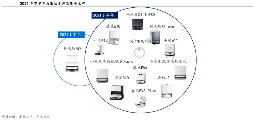 經(jīng)典案例:根據(jù)奧維云網(wǎng)、華泰研究等綜合資訊表明,2021年10月,石頭科技發(fā)布旗下首款自清潔類產(chǎn)品G10,隨后科沃斯、云鯨也推出自清潔類產(chǎn)品 2.0 版本,分別是科沃斯 X1 系列和云鯨 J2 系列??莆炙?nbsp;X1 系列主打自清潔、自動集塵二合一全能型基站,云鯨 J2 系列則是引入自動上下水功能,省去加水、換水的人工 操作,實現(xiàn)“拖地功能的全自動化”。除此之外,中小品牌也積極創(chuàng)新,提出水箱殺菌、加熱等產(chǎn)品解決方案。