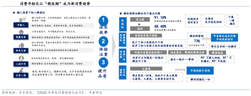 經(jīng)典案例:根據(jù)京東家電、《2020年家電消費趨勢白皮書》、華泰研究等綜合資訊表明,隨著消費者年齡代際的持續(xù)更替,家電消費正加速進入 90 后、00 后主導的 時代,其中又以掃地機器人、洗地機等智能家電最為明顯。年輕消費主力消費能力明顯提升,并且強調(diào)品質(zhì)消費,因而“精致懶”已經(jīng)成為一大新消費趨勢。