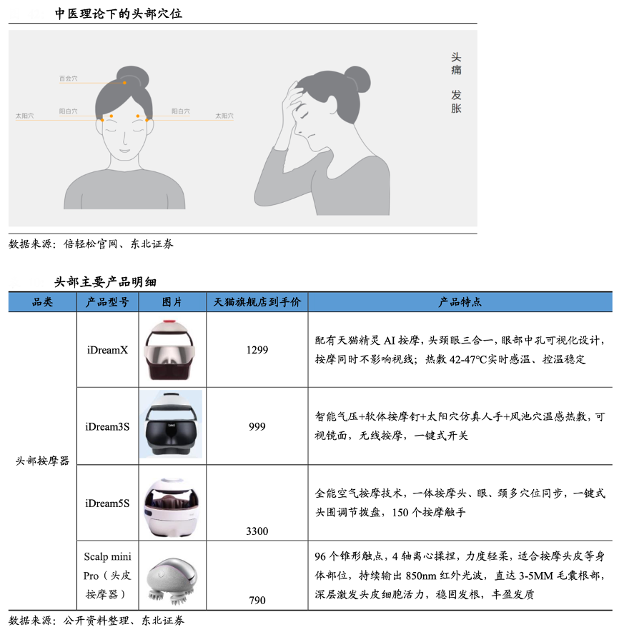 經(jīng)典案例:根據(jù)倍輕松官網(wǎng)、公開資料、東北證券等綜合資訊表明,頭部產(chǎn)品 iDream 和 Dream 系列可提供頭頸眼等多部位立體保健按摩。以目前熱銷的 iDream 5s 為例,其內(nèi)含 150 多個按摩觸手,可實現(xiàn)頭、眼和頸部的多穴位同步氣壓按摩,疏通經(jīng)絡(luò),搭配治愈音樂,可以極大的緩解工作壓力,改善睡眠狀態(tài)。